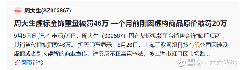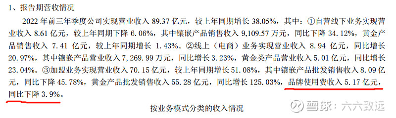 周大生(002867):每股净资产 5.26元,每股净利润 1.12元,历史净利润年均增长 18.0%,预估未来三年净利润年均增长 12.0%,更多数据见:周大生002867核心经营数据 周大生的当前股价 12.55元,市盈率 11.97,未来三年的估值假设和预期收益率如下:15倍PE,预期收益率 88.07%;20倍PE,预期收益率 150.76%;25倍PE,预期收益率 213.45%;30倍PE,预期收益率 276.14%。 周大生发布的三季报业绩,基本在预料之中,很多人前几天看到股价涨上去了点,就认为周大生还不错,比如模式很好,管理层还算进取等等。 股价这东西,真不能说明什么,比如今天大跌,也不能证明我六致远就是对的,关键还是要能看懂公司的行为是否正确,管理层是否具备较好的管理水平。我之前就有判断,周大生的高管层水平应该很一般,甚至可以用平庸来形容。现在仍然是这个观点。 先看看三季报的一些数据,数据只能是经营的结果,关键是能从这些结果中看到公司的一些具有本质性的内容,这些本质性的内容才会决定公司未来的状况。 首先,前三季度实现营业收入89.37亿元,同比增长38.05%。这个营收,之前早就说过,是周大生把黄金收入算入营收变化而导致的,2021年7月之前,周大生只收取加盟商黄金的加盟服务费,黄金金价本身是结算给上游黄金工厂的。现在周大生采取省代的模式,把加盟服务费提高,和省代分成,等于先把黄金过一道手,卖给省代,然后再给加盟商。这样黄金金价结算就算周大生的营收了。 这种不改变业务本质,只是玩个记账游戏的做法,也反映出此家公司有投机取巧的风格。而且,也暴露出周大生自己缺乏上游黄金生产的资源,这种靠拿来主义,长期玩贴牌的风格,却喊着要把黄金作为主力,你觉得有几分成功的把握呢? 况且我们看到实际第三季度的营收增长只有4.19%了。之前半年报营收可是大幅 增长82.79%的。这就是因为2021年7月之前,黄金没算入营收,到2022年同期,黄金算入营收,只是因为核算口径不同造成的,实际业务状况没什么关系。我在前文中,就说这件事情的性质——“原地杵”。从三季报同期的增长来看,已经得到印证! 如果剔除这个统计口径的变化,估计真实的营收就是大幅下滑的了。 再看净利润的情况,就更加露骨了。扣非之间下滑19.4%。不是营收是增长的吗?不是开店也是净增长的吗?但很可惜,这只是表象,门店盈利状况才是最根本的决定因素。 为什么说门店的盈利状况是不理想的呢。 我们看三季报中说得“报告期营收情况”中所说得,黄金产品批发销售收入55.28亿,同比增长125.03%,但品牌使用费收入5.17亿,却同比下滑3.9%。周大生的品牌使用费,就是指加盟商拿黄金产品,交给品牌公司的贴牌费。按道理说,你黄金产品销售量又放大了,店数又增加了。你的品牌使用费应该是增加的才是啊。为何还是降低的呢? 推测只有两种可能,一种是黄金营收的增加只是一个虚幻的景象,也就是实际销量并没有增加,只是原来没计入进来的黄金克重的金价,现在计入进来了。比如以前加盟商拿1克黄金产品,金价400元,交工厂,不算周大生营收,品牌使用费6元交周大生,算营收。现在金价400元也算周大生营收,品牌使用费涨一倍,12元交周大生也算营收。但即便如此大幅度的骚操作,品牌使用费却仍然是下降的。因为根本的黄金销售量,或者说经销商的进货量下降了。 还一种可能,就是周大生给予了加盟商优惠政策,比如少收了贴牌费。不过按周大生对待加盟商的风格,这个可能性比较小。否则不会在2021年,行业最困难的时候,为勉强保持利润,还狠狠宰加盟商一刀,把品牌使用费翻倍。 这个行为非常明显地反映出,周大生公司的管理层不具备双赢共利的价值观,而是急于短期利益,杀鸡取卵的风格明显。这样的管理层怎么可能具备优秀的长远目光,和高水平的市场运作水平呢? 有些人说周大生的管理层还算进取,说句实话,我是不敢苟同,这种“进取”充其量也就是对利润,对利益的过渡贪婪而已。 通过观察其他从业人员的信息,也可以印证,周大生的加盟商门店盈利情况是比较堪忧的。 这是公开在互动易中看到的,类似这样的信息还有很多。 位置最好,销售却最差。为什么?联想到周大生经常出现的货品质量信息,只能感觉这家公司“进取”的方向或许真的有偏差。 建议周大生管理层,还是要扎扎实实做产品、踏踏实实做市场,真真正正善待加盟商,如果只是在玩弄收入口径,忽悠加盟商,忽悠消费者,迟早会现出“贪婪式进取”的原形! 本人已经不持有周大生股票,对该公司进行观察分析,纯粹出于对企业研究的爱好,没有任何针对的意思。 本文所有运用材料,均来自公开和客观的资料。并无主观捏造的任何事实在内。 如果有人对该文有切实正当合理的意见,我可以将文中公司名称隐藏或者去除,甚至删除。 如果因为爱屋及乌,恨屋及乌,而进行人身攻击的,一律拉黑。如果是实事求是的就对企业的分析有交流的,本人非常欢迎! 以上分析,仅作为企业分析认知,不涉及股价,不作为任何投资买卖建议。请个人独立判断! 本人以上认识,由于受个人的认知局限!可能存在严重的认知偏差,请个人独立判断! 我是六致远,感谢您的关注!欢迎探讨! $周大生(SZ002867)$ $老凤祥(SH600612)$ $中国黄金(SH600916)$ $ 作者:六六致远原文链接:https://xueqiu.com/4263172379/234636512 转载请注明:www.51xianjinliu.com » 周大生三季报观察—进取方向与价值观或有偏差 喜欢 (0)or分享 (