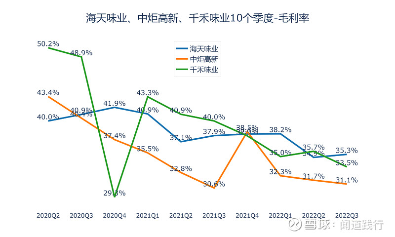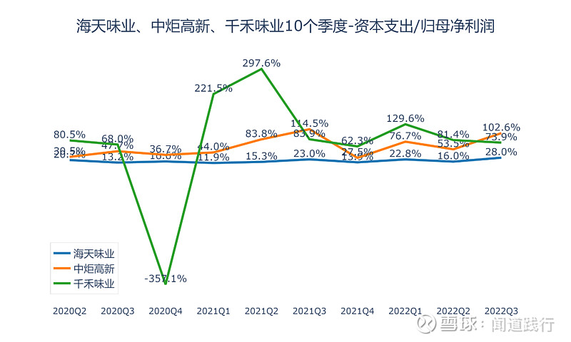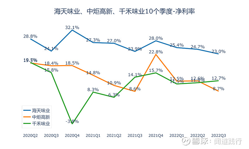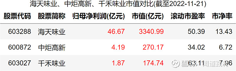 海天味业(603288):每股净资产 5.37元,每股净利润 1.58元,历史净利润年均增长 20.57%,预估未来三年净利润年均增长 12.19%,更多数据见:海天味业603288核心经营数据 海天味业的当前股价 80.2元,市盈率 56.05,未来三年的估值假设和预期收益率如下:15倍PE,预期收益率 -62.06%;20倍PE,预期收益率 -49.42%;25倍PE,预期收益率 -36.77%;30倍PE,预期收益率 -24.13%。 民以食为天,我国14亿人口,按正常的饮食,一天就要消耗70万吨粮、9.8万吨油、192万吨菜和23万吨肉。一年下来,简直是个天文数字: 这也是为什么食品行业容易出长牛的原因,那是14亿人的刚需。 我国食品加工行业众多,A股上市的公司总共78家: 这些公司,哪家最有发展前景呢? 今天,我们一起看一下调味品发酵行业的三家公司:海天味业、中炬高新和千禾味业。 本文主要包括5个方面:盈利能力、运营能力、偿债能力、成长能力和目前估值,看完,希望能加深你对这些公司的理解。 说明:以下所有财务数据,均来自于各上市公司的年报。 1、盈利能力 1)主营业务及占比 三家公司,主要产品都是家用调味品,包括酱油、食醋等。毛利率整体还不错。 2)营收及归母净利润 营收,海天味业最高,其次是中炬高新,千禾味业第三。 归母净利润,海天味业遥遥领先,其次是中炬高新,千禾味业第三。 扣非净利润,海天味业遥遥领先,其次是中炬高新,千禾味业第三。 3)毛利率 毛利率,千禾味业最高,其次是海天味业,中炬高新第三。 4)净利率 净利率,海天味业最高,其次是中炬高新,千禾味业第三。 5)经营活动现金流净额 经营活动现金流,海天味业遥遥领先,其次是中炬高新,千禾味业第三。 6)归母净利润转换为经营活动现金流的能力 积累现金的能力,中炬高新最强,其次是千禾味业,海天味业第三。 2、运营能力 1)总资产周转率 总资产周转率,海天味业最高,其次是中炬高新,千禾味业第三。 2)存货及存货周转率 存货,海天味业最高,其次是中炬高新,千禾味业最低。 存货占营收的比例,中炬高新最高,其次是千禾味业,海天味业最低。 存货周转率,海天味业最高,其次是千禾味业,中炬高新第三。 3)应收账款及应收账款周转率 应收账款,这三家都不高,千禾味业最高,其次是海天味业,中炬高新最低。 应收账款占营收的比例,这三家整体不高,千禾味业最高,其次是中炬高新,海天味业最低。 应收账款周转率,海天味业最高,其次是中炬高新,千禾味业第三。 4)合同负债及占比 合同负债,差异较大,海天味业最高,其次是中炬高新,千禾味业第三。 合同负债占营收的比例,海天味业遥遥领先,长期维持在40%左右;其次是中炬高新,千禾味业第三。相比而言,海天的产品,还是最受欢迎的。 5)固定资产占比 固定资产占总资产的比例,千禾味业最高,长期维持在30%左右;其次是中炬高新,海天味业最低。 3、偿债能力 1)资产负债率 资产负债率,这三家整体不高,中炬高新最高,其次是海天味业,千禾味业最低。 2)有息负债 有息负债,中炬高新最高,其次是海天味业,千禾味业最低。 3)现金余额 现金余额,海天味业遥遥领先,其次是中炬高新,千禾味业最低。 4)有息负债占现金余额的比例 有息负债占现金余额的比例,中炬高新最高,其次是千禾味业,海天味业最低。 5)资本支出及占比 资本支出,海天味业最高,其次是中炬高新,千禾味业最低。 资本支出占归母净利润的比例,差异较大,千禾味业最高,长期维持在60%以上;其次是中炬高新,海天味业最低。相比而言,海天味业确实是一门好生意。 4、成长能力 1)营收增长率 营收增速,千禾味业最快,其次是海天味业,中炬高新第三。 2)净利润增速 净利润增速,千禾味业最快,其次是中炬高新,海天味业第三。 3)销售费用占比 销售费用占营业总收入的比例,千禾味业最高,其次是中炬高新,海天味业最低。 4)研发投入及占比 研发投入,海天味业最高,其次是中炬高新,千禾味业最低。 研发投入占营收的比例,海天味业最高,其次是中炬高新,千禾味业最低。 5)净资产收益率 净资产收益率,海天味业最高,其次是中炬高新,千禾味业第三。 6)机构盈利预测 这几家公司,未来3年的盈利情况,机构预测如下: 按机构的预测,千禾味业增速最快,中炬高新增速最慢。 5、目前估值 1)滚动市盈率 目前海天味业的滚动市盈率为50.39,处于10年来56.26的分位值: 目前中炬高新的滚动市盈率为34.03,处于10年来18.28的分位值: 目前千禾味业的滚动市盈率为63.11,处于6年来53.77的分位值: 2)市净率 目前天味业的市净率为13.44,处于8年来42.57的分位值: 目前中炬高新的市净率为6.72,处于10年来61.09的分位值: 目前千禾味业的市净率为7.96,处于6年来70.97的分位值: 6、总结 通过以上对比分析,这几家公司整体能力如下图所示: 可以看出: 1)盈利能力,整体而言,海天味业>中炬高新>千禾味业 2)运营能力,整体而言,海天味业>千禾味业>中炬高新 3)偿债能力,整体而言,千禾味业>海天味业>中炬高新 4)成长能力,整体而言,中炬高新>千禾味业>海天味业 5)目前估值,所处分位,千禾味业>中炬高新>海天味业 这几家公司目前的净利润和市值对比如下: 看完以上对比分析,你认为谁最有投资价值呢? 以上所有分析,都是基于历史财务数据,仅作参考,不作为任何投资建议。 $海天味业(SH603288)$ $中炬高新(SH600872)$ $千禾味业(SH603027)$ #能从容应对赎回的债基有哪些# #医药行情还能持续多久?# #资金回流,赛道基金可以布局了吗# @今日