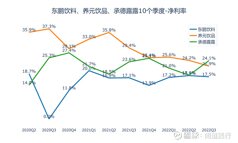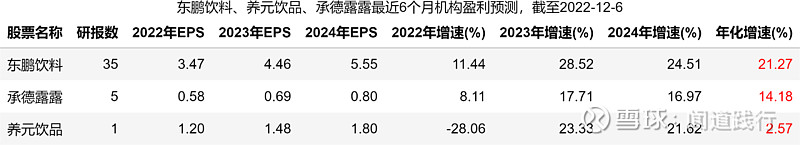 承德露露(000848):每股净资产 2.39元,每股净利润 0.54元,历史净利润年均增长 11.13%,预估未来三年净利润年均增长 14.96%,更多数据见:承德露露000848核心经营数据 承德露露的当前股价 8.49元,市盈率 15.5,未来三年的估值假设和预期收益率如下:15倍PE,预期收益率 44.95%;20倍PE,预期收益率 93.27%;25倍PE,预期收益率 141.58%;30倍PE,预期收益率 189.9%。 养元饮品(603156):每股净资产 8.67元,每股净利润 1.67元,历史净利润年均增长 50.21%,预估未来三年净利润年均增长 2.63%,更多数据见:养元饮品603156核心经营数据 养元饮品的当前股价 21.72元,市盈率 18.47,未来三年的估值假设和预期收益率如下:15倍PE,预期收益率 24.67%;20倍PE,预期收益率 66.23%;25倍PE,预期收益率 107.79%;30倍PE,预期收益率 149.35%。 30年前,能喝上饮料,是一件很奢侈的事情,如今,各式各样的碳酸饮料、奶茶、果汁充斥着各大超市。 根据国家统计局数据显示,2020年全年,我国饮料零售额突破2000亿元,达到2294亿元,我国已经成为饮料消费大国。 饮料已经成为人们生活中不可或缺的一部分,饮料行业,有哪些投资机会呢? 今天,我们一起看一下饮料行业的3家公司:东鹏饮料、养元饮品和承德露露: 截至今年3季度,这三家公司赚的钱,在A股饮料行业占比高达78%: 本文主要包括5个方面:盈利能力、运营能力、偿债能力、成长能力和目前估值,看完,希望能加深你对这些公司的理解。 说明:以下所有财务数据,均来自于各上市公司的年报。 1、盈利能力 1)主营业务及占比 三家公司,2021年营收都在70亿以内,毛利率比较高。 2)营收及归母净利润 营收,东鹏饮料最高,其次是养元饮品,承德露露第三。 归母净利润,养元饮品最高,其次是东鹏饮料,承德露露第三。 扣非净利润,养元饮品最高,其次是东鹏饮料,承德露露第三。 3)毛利率 毛利率,养元饮品最高,其次是承德露露,东鹏饮料第三。 4)净利率 净利率,养元饮品最高,其次是承德露露,东鹏饮料第三。 5)经营活动现金流净额 经营活动现金流,东鹏饮料最高,养元饮品非常不稳定。 6)归母净利润转换为经营活动现金流的能力 积累现金的能力,东鹏饮料最强,养元饮品波动非常大。 2、运营能力 1)总资产周转率 总资产周转率,东鹏饮料最高,其次是承德露露,养元饮品第三。 2)存货及存货周转率 存货,养元饮品最高,其次是东鹏饮料,承德露露最低。 存货占营收的比例,养元饮品最高,其次是承德露露,东鹏饮料最低。 存货周转率,东鹏饮料最高,其次是承德露露,养元饮品第三。 3)应收账款及应收账款周转率 应收账款,养元饮品最高,其次是东鹏饮料,承德露露最低。 应收账款占营收的比例,三家都非常低。 应收账款周转率,三家都非常高。 4)合同负债及占比 合同负债,东鹏饮料最高,其次是养元饮品,承德露露第三。 合同负债占营收的比例,养元饮品最高,看来养元饮品还是挺好卖的;其次是东鹏饮料,承德露露第三。 5)固定资产占比 固定资产占总资产的比例,东鹏饮料遥遥领先,其次是承德露露,养元饮品第三。 3、偿债能力 1)资产负债率 资产负债率,东鹏饮料遥遥领先,其次是承德露露,养元饮品第三。 2)有息负债 有息负债,东鹏饮料最高,其次是养元饮品,承德露露几乎为零。 3)现金余额 现金余额,养元饮品最高,其次是承德露露,东鹏饮料最低。 4)有息负债占现金余额的比例 有息负债占现金余额的比例,东鹏饮料最高,养元饮品和承德露露都非常低。 5)资本支出及占比 资本支出,东鹏饮料最高,其次是养元饮品,承德露露第三。 资本支出占归母净利润的比例,东鹏饮料最高,其次是养元饮品,承德露露第三。 4、成长能力 1)营收增长率 营收增速,东鹏饮料最快,其次是承德露露,养元饮品第三。 2)净利润增速 净利润增速,东鹏饮料最快,其次是承德露露,养元饮品第三。 3)销售费用占比 销售费用占营业总收入的比例,东鹏饮料最高,其次是养元饮品,承德露露最低。 4)研发投入及占比 研发投入,养元饮品最高,其次是东鹏饮料,承德露露最低。 研发投入占营收的比例,养元饮品最高,其次是承德露露,东鹏饮料最低。 5)净资产收益率 净资产收益率,东鹏饮料最高,其次是承德露露,养元饮品第三。 6)机构盈利预测 这几家公司,未来3年的盈利情况,机构预测如下: 按机构的预测,东鹏饮料增速最快,养元饮品增速最慢。 5、目前估值 1)滚动市盈率 目前东鹏饮料的滚动市盈率为55.08,处于1年来50.67的分位值: 目前养元饮品的滚动市盈率为17.45,处于4年来79.79的分位值: 目前承德露露的滚动市盈率为15.68,处于10年来6.01的分位值: 2)市净率 目前东鹏饮料的市净率为15.62,处于1年来45.31的分位值: 目前养元饮品的市净率为2.37,处于4年来13.27的分位值: 目前承德露露的市净率为3.59,处于10年来10.25的分位值: 6、总结 通过以上对比分析,这几家公司整体能力如下图所示: 可以看出: 1)盈利能力,整体而言,东鹏饮料>养元饮品>承德露露 2)运营能力,整体而言,东鹏饮料>承德露露>养元饮品 3)偿债能力,整体而言,养元饮品>承德露露>东鹏饮料 4)成长能力,整体而言,东鹏饮料>承德露露>养元饮品 5)目前估值,所处分位,东鹏饮料>养元饮品>承德露露 这几家公司目前的净利润和市值对比如下: 看完以上对比分析,你最看好哪家呢? 以上所有分析,都是基于历史财务数据,仅作参考,不作为任何投资建议。 公司深入分析:【合集】公司深入分析 $东鹏饮料(SH605499)$ $养元饮品